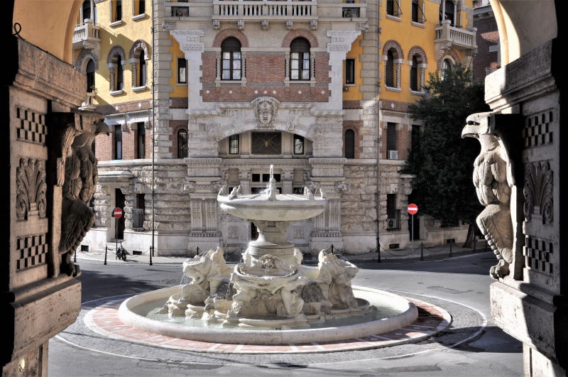 Progettata da Gino Coppedè nel 1920, la fontana fu realizzata nel 1924 con alcune significative varianti: al posto dell’aiuola verde circolare con ciglio lapideo fu posizionata la vasca chiamata comunemente “il laghetto”.