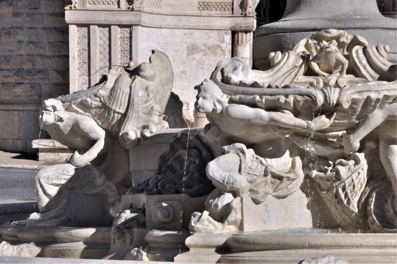 Intervallano i gruppi scultorei sono intervallati da quattro massi l sormontati da una valva di conchiglia e da un’ape. Intorno al bacino corre un marciapiede con ciglio in travertino, suddiviso da fasce ortogonali in travertino ornate da losanghe.