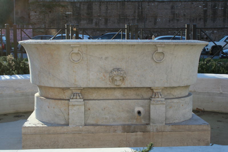 All’interno di un bacino posto a livello del terreno è stata collocata infatti una vasca in porfido di presumibile provenienza termale, ornata da due protomi leonine e quattro anelli scolpiti a rilievo.