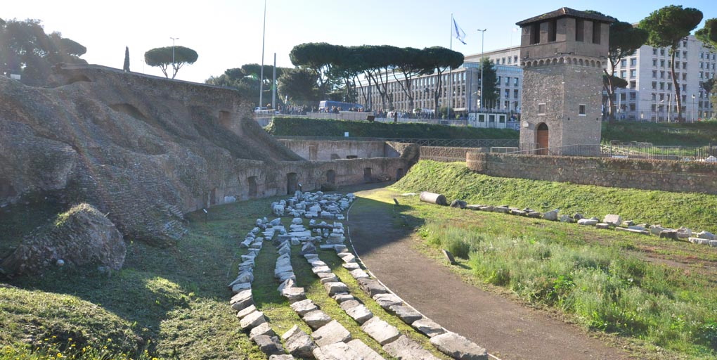 I margini dell’area archeologica sono stati provvisti di idonea recinzione di forma semicircolare in corrispondenza dell’emiciclo, seguendo il perimetro della costruzione romana fino all’ideale inizio della spina, la lunga piattaforma posizionata al centro della pista che era decorata con statue, tempietti, vasche, con due grandi obelischi egizi – che dal ‘500 sono stati ricollocati in piazza S. Giovanni in Laterano ed in Piazza del Popolo – e dotata di metae, i grandi segnacoli intorno ai quali giravano i carri.