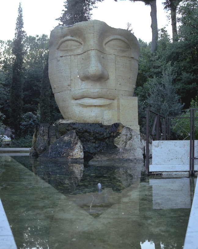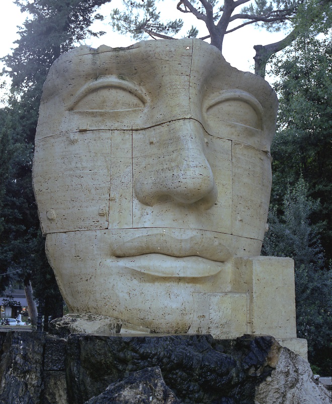 L’opera, costituita da più blocchi di travertino con i giunti ben visibili, raffigura un frammento di volto femminile dai lineamenti fortemente idealizzati, segnato da piccole bugne.