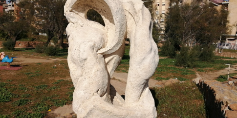 La scultura, realizzata da Gaetano Gizzi nel 1983 in travertino sbozzato, si presenta come un monolite squarciato e rappresenta un groviglio di corpi avviluppati.