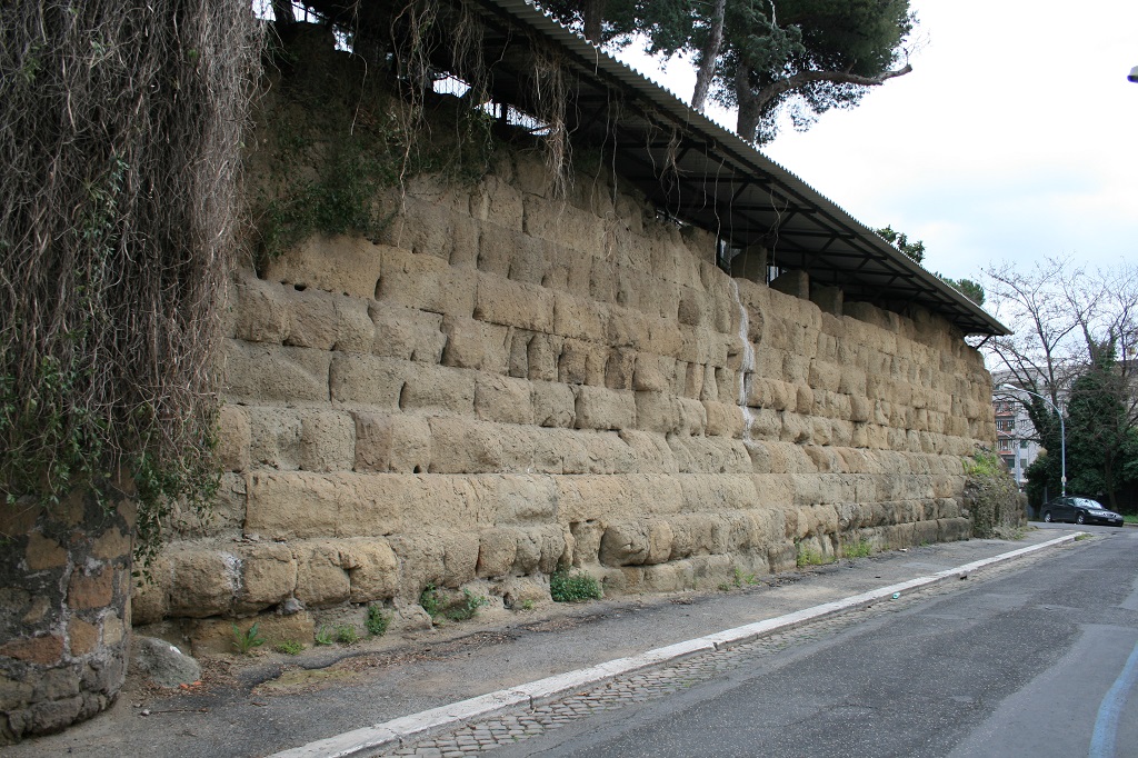 Resti di murature in grandi blocchi di tufo giallo, in alcuni casi poco visibili, in altri imponenti, costituiscono oggi la sola testimonianza della cinta muraria nota come Mura Serviane. Del più antico recinto, databile effettivamente al VI secolo a. C. e attribuito all’iniziativa del re Servio Tullio, si conservano alcuni avanzi in blocchi più piccoli di tufo granulare grigio. La gran parte di quanto si conserva delle mura va in realtà assegnata alla ricostruzione effettuata agli inizi del IV secolo a.C., poco dopo il grande saccheggio di Roma ad opera dei Galli nel 390 a.C. Questa datazione, oltre che dalle fonti letterarie, è confermata proprio dall’utilizzo di un particolare tipo di tufo, detto “tufo giallo di Grotta Oscura”, le cui cave si trovavano nel territorio di influenza della città etrusca di Veio; l’impiego massiccio a Roma di questo tipo di tufo si deve quindi datare successivamente alla conquista della città avvenuta nel 396 a.C.
