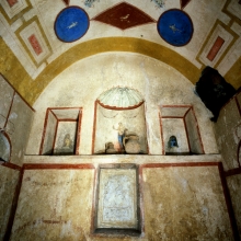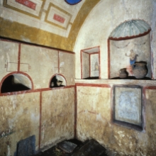 Colombario 1: attraverso una porta fiancheggiata da due finestre a feritoia si accede alla camera sepolcrale con pavimento in terra battuta.
