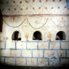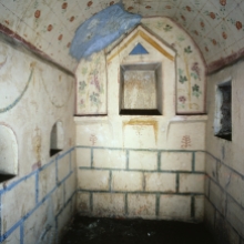 Le pareti interne sono rivestite di intonaco dipinto. Particolarmente ricca è la decorazione della volta con figure inserite in campi geometrici colorati su fondo bianco.