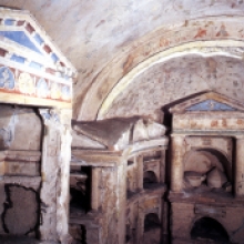 Alla camera sepolcrale si accede con una ripida scala che immette in un ambiente rettangolare coperto da una volta finemente decorata a motivi vegetali. Al centro delle pareti, le nicchie per le olle dei defunti sono contenute in piccole strutture architettoniche conformate a edicole, con colonnine e timpano, decorate da pitture e da stucchi. Nell’edicola centrale della parete di fondo sono dipinte due figure, probabilmente i fondatori del sepolcro, i cui nomi sono indicati nella tabella marmorea sottostante: Granius Nestor e Vinileia Hedone.