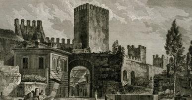 La porta Tiburtina è un monumento complesso, cresciuto nel tempo attorno all’arco di travertino che permetteva alle acque Marcia, Tepula e Julia di scavalcare la via Tiburtina.