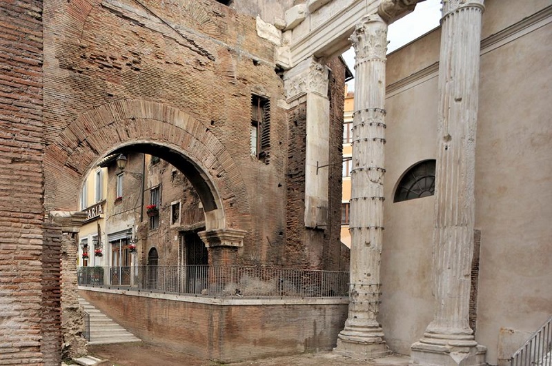 Il complesso del portico d'Ottavia prospiciente sul Circo Flaminio (area che corrisponde all'antico ghetto) fu ricostruito da Augusto, al posto del più antico portico di Metello, tra il 27 ed il 23 a.C. e dedicato alla sorella Ottavia.