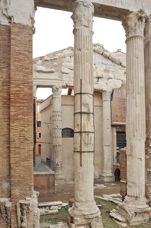 In età tardoantica e medievale gli spazi porticati del monumento vengono utilizzati per la vendita del pesce, caratterizzando questa zona come la Pescheria, il principale mercato cittadino per la vendita del pesce che rimarrà attivo fino alla fine dell’800. Nell’ultimo quarto dell’VIII secolo sulle strutture del portico e dei monumenti adiacenti si ricavano gli ambienti della diaconia di S. Angelo in Pescheria, che inglobano una delle colonne posteriori e parte del timpano, ancora visibile all’interno della chiesa.