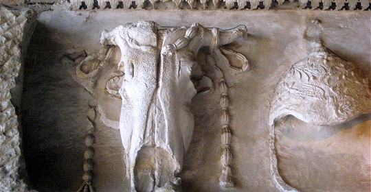 L'alto podio del tempio ha un nucleo interno in calcestruzzo rivestito esternamente di travertino.