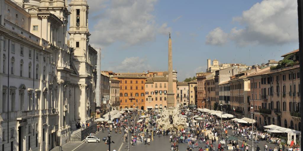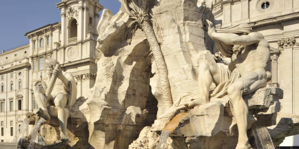 Magistrale fusione di architettura e scultura, la fontana dei Quattro Fiumi esprime movimento in ogni suo particolare scultoreo, dalla vegetazione, alle statue, alla fauna rappresentata nel bacino e sulla scogliera, divenendo il fulcro dell’intero spazio circostante.