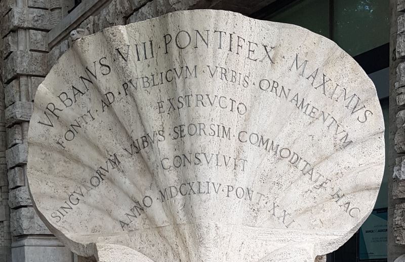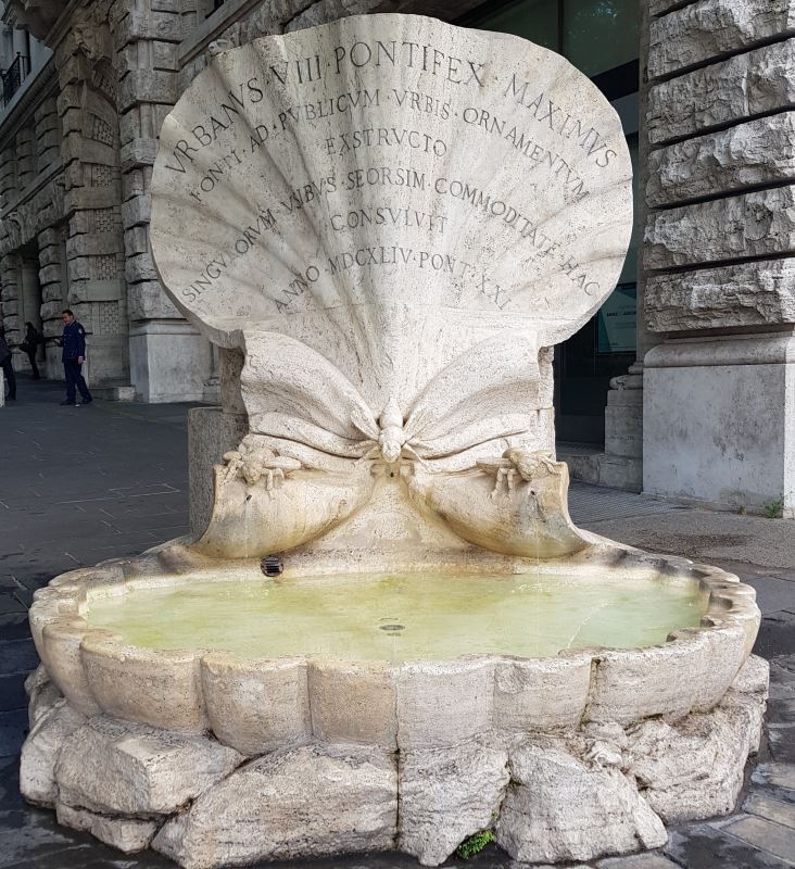 La fantasia dell’artista, tuttavia, diede ad una struttura di servizio, l’insolita forma di una conchiglia bivalve aperta. La valva più in basso fungeva da catino, mentre l’altra valva, modellata per aderire all’angolo dell’edificio retrostante, era decorata alla base da tre api (simbolo araldico della casata del Pontefice). Un’iscrizione ricordava l’intervento del papa per la costruzione della fontana e del fontanile come “pubblico ornamento della città”.