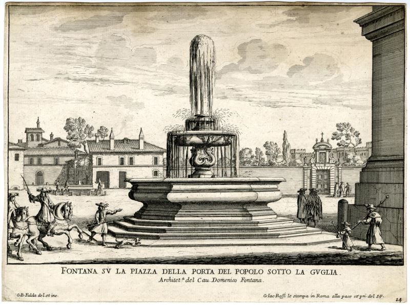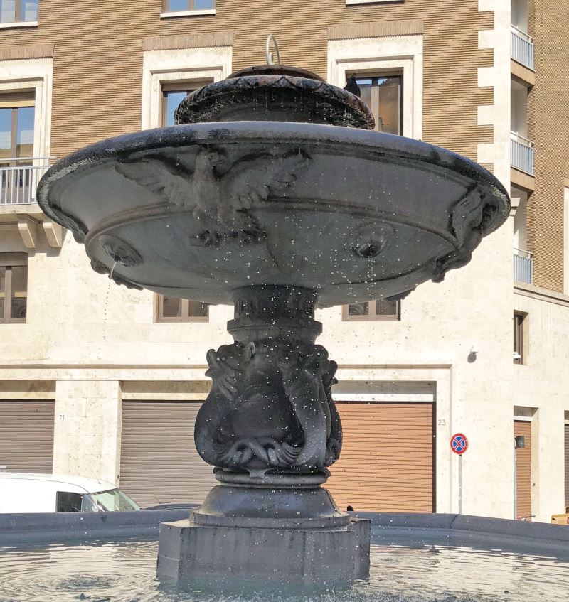 Un’incisione del 1665 di Giovan Battista Falda ne riproduce l’aspetto originario con la vasca a forma ottagonale alla base e due tazze circolari concentriche sorrette da quattro delfini.